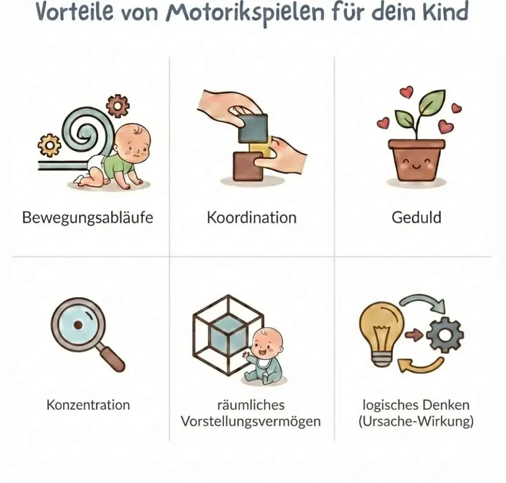 Motorikspielzeug ist kein „Training“, das schnelle Ergebnisse liefern muss. Es ist vielmehr eine Einladung: ausprobieren, scheitern, noch einmal versuchen – und irgendwann klappt es. Genau diese Wiederholung ist der Schlüssel. Motorikspielzeug hilft deinem Baby dabei, seine Hände gezielter einzusetzen. Greifen, festhalten, drehen oder schieben sind kleine Handlungen, die für dein Kind große Entwicklungsschritte bedeuten. Anfangs erfolgen viele Bewegungen noch reflexartig, doch diese Reflexe werden nach und nach durch gezielte Bewegungen ersetzt.