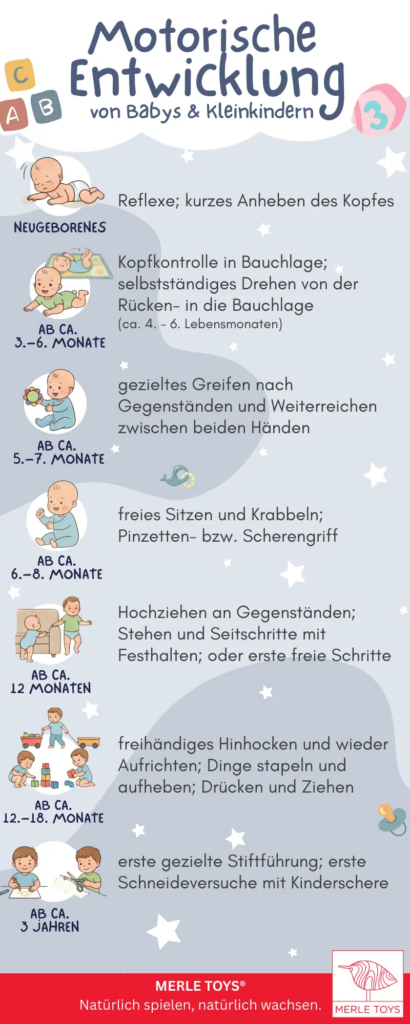 Jedes Kind entwickelt motorische Fähigkeiten in seinem eigenen Tempo. Dennoch gibt es typische Entwicklungsschritte, die dir als Orientierung dienen können. Die folgende Infografik zeigt, welche motorischen Meilensteine in den einzelnen Entwicklungsphasen typisch sind: