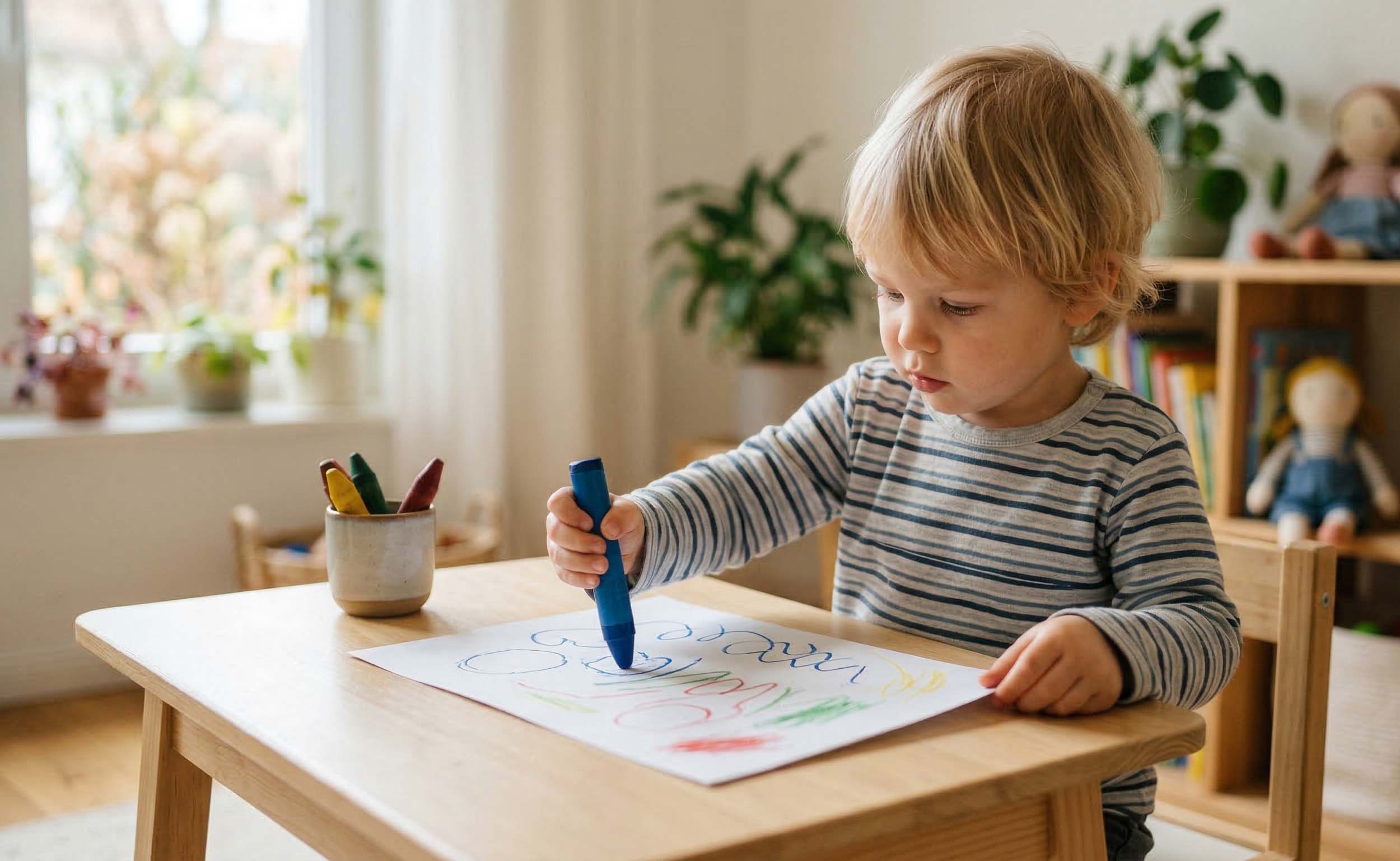 Mit etwa drei Jahren werden auch feinmotorische Fähigkeiten immer genauer. Viele Kinder beginnen jetzt, einen Stift gezielt zu führen und einfache Linien oder Formen zu malen. Auch erste Schneideversuche mit einer Kinderschere sowie Basteln sind in diesem Alter typisch. Diese Fähigkeiten sind wichtige Vorstufen für das spätere Schreibenlernen.