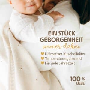 Geborgenheit entsteht durch die kleinen, aber bedeutenden Momente – durch Nähe, zarte Berührungen und wohltuende Wärme. Unsere Babydecke Strick aus 100 % Bio-Baumwolle bietet deinem Baby genau dieses Gefühl der Sicherheit. Sie ist angenehm weich, warm und mit viel Liebe gefertigt, sodass sich dein Baby rundum wohlfühlt und geborgen ist.