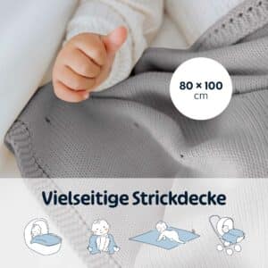 Dank ihrer weichen, elastischen Struktur lässt sich unsere Baby Decke aus Baumwolle auf vielfältige Weise verwenden: als kuschelige Spieldecke, praktische Wickelunterlage für unterwegs oder als gemütliche Unterlage für die Bauchzeit. Auch als stilvolles Wohnaccessoire auf dem Schaukelstuhl oder Sofa macht sie sich wunderbar. Mit ihren praktischen Maßen von 80 x 100 cm passt die Decke problemlos in den Kinderwagen, die Reisetasche oder den Buggy – ideal für unterwegs. Unsere Babydecke aus Strick wird aus reiner, atmungsaktiver Bio-Baumwolle gefertigt, die auf natürliche Weise für eine ausgeglichene Temperatur sorgt: Im Winter hält sie angenehm warm, im Sommer bleibt sie leicht und luftdurchlässig. So schafft sie das ganze Jahr über ein angenehmes Wohlfühlklima für dein Baby. Und selbst wenn dein Baby größer wird, bleibt sie ein wertvolles Stück – sei es für Kuscheltiere, Puppen oder einfach als vertrauter Begleiter aus den ersten Lebensjahren.